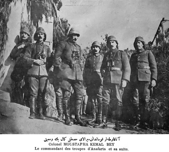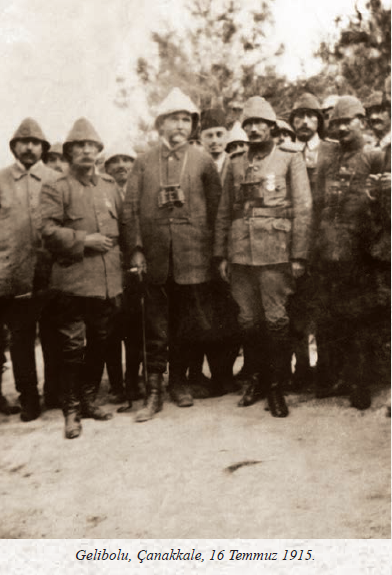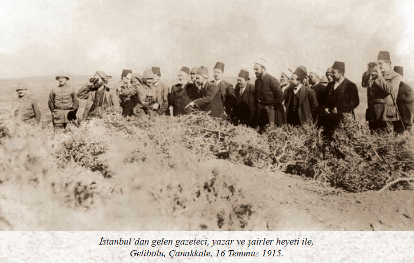 (Bu fotoğraftaki tarih kontrol edilmelidir. Zira kaynaklara göre Hamdullah Suphi (Tanrıöver), Ahmet Ağaoğlu, Ali Canip (Yöntem), Ömer Seyfettin, Mehmet Emin (Yurdakul), İbrahim Alaettin (Gövsa), Hakkı Süha (Gezgin), Enis Behiç (Koryürek)'in aralarında olduğu heyet 16 Temmuz günü 5. Ordu ve 3. Kolordu karargahlarını ziyaret etmiş, Arıburnu ve Seddülbahir savaş alanlarını gezmiştir. Ancak Cesarettepe'ye giden yolun tehlikeli oluşu nedeniyle Atatürk'ü ziyaret edememiş, ancak telefonla konuşarak başarılarını kutlamıştır.)