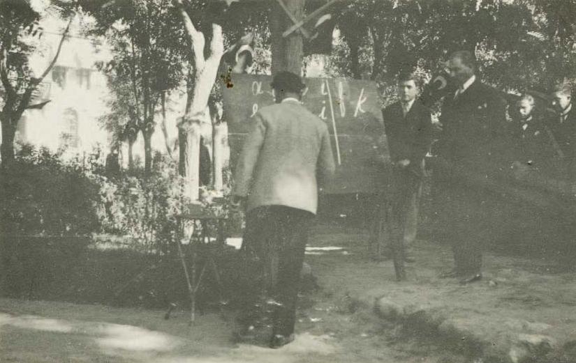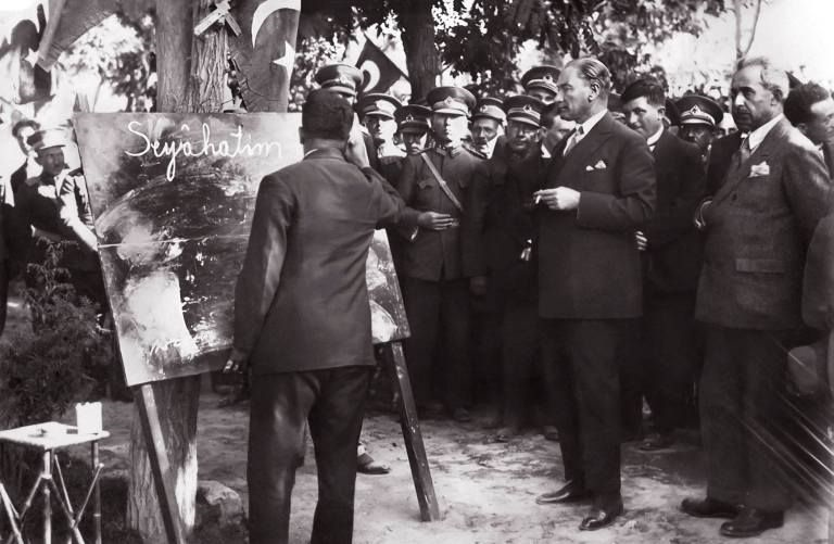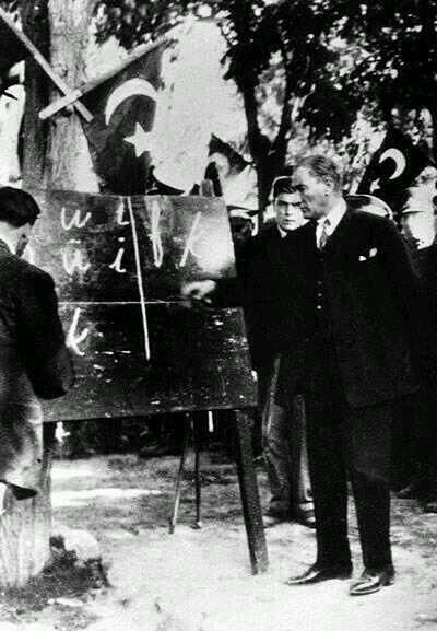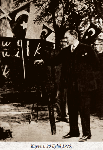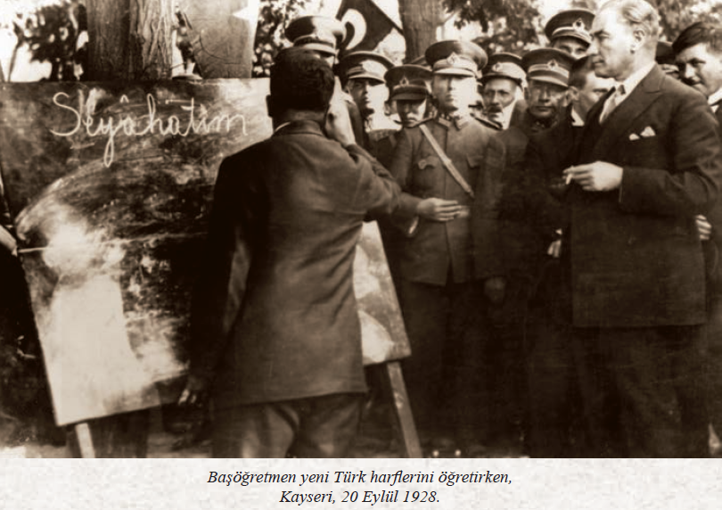 Harf Devrimi’nin en heyecanlı günlerinde, Sivas’tan Ankara'ya dönüşte 20 Eylül 1928 günü, Başbakan İsmet (İnönü) ile birlikte saat 14:30 da Kayseri’ye gelen Atatürk, yolda, Gezi bucağında toplanan halka yeni harflerle ilgili sorular sorar. Kayseri'de Belediye bahçesine konulan kara tahta ve tebeşir yardımı ile halkla yeni harfler konusunda sohbet eder, onlara sorular sorar, açıklamalarda bulunur. Gerçekten okuma-yazma seferberliği olumlu gitmekte, yediden yetmişe herkes elinde defter kalem yeni harfleri öğrenmeye ve yazmaya çalışmaktadır. Atatürk, bir başöğretmen olarak başlattığı devrimin en önde gelen görevlisi idi. Gözlemlerinden çok memnundur. Kayseri'de kısa bir süre kalan Atatürk Ankara'ya doğru yoluna devam eder.